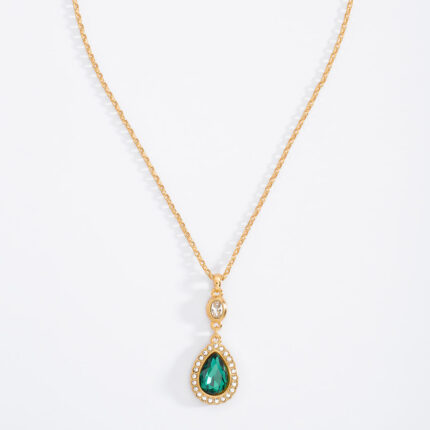 ARETES CON POSTE EN BAÑO DE ORO CON PIEDRA GOTA EN TONO CRISTAL Y PIEDRAS COLOR ESMERALDA