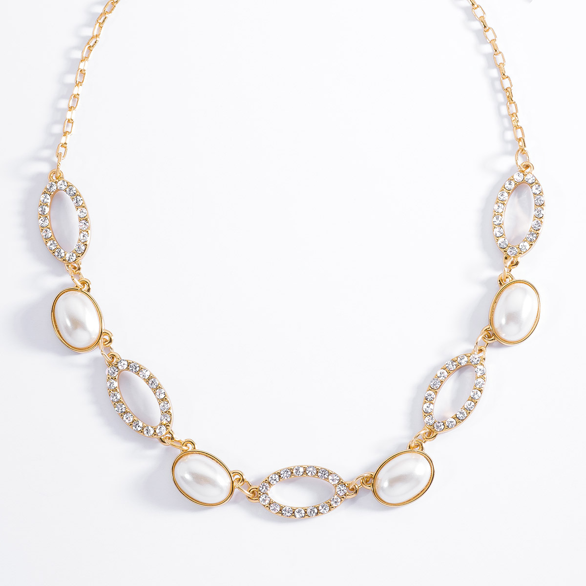 COLLAR EN BAÑO DE ORO DE 40 CM + 10 CM DE EXT. CON PIEDRAS COLOR CRISTAL Y PERLAS COLOR CREAM