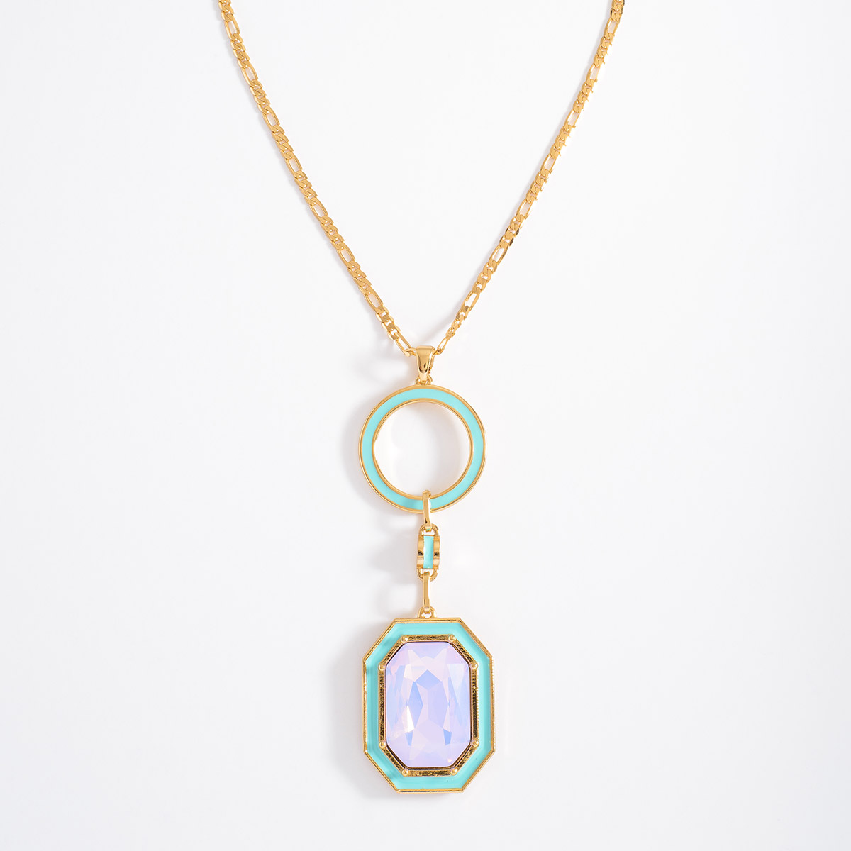 COLLAR EN BAÑO DE ORO DE 42 CM + 10 CM DE EXT. CON PIEDRA COLOR ÓPALO VIOLETA CON ESMALTE COLOR VERDE AGUA