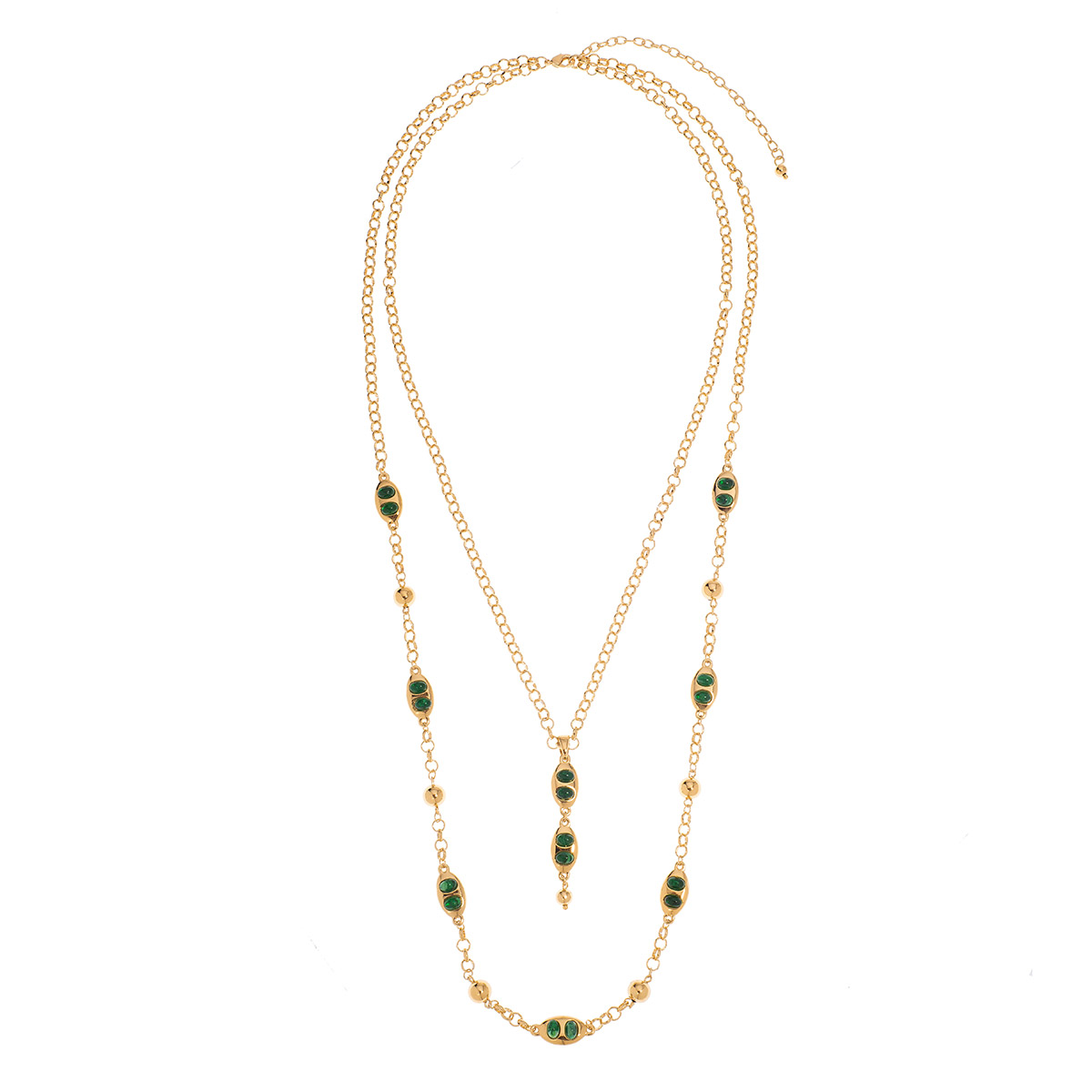 COLLAR EN BAÑO DE ORO DE 61 CM 10 CM DE EXT. CON PIEDRAS COLOR ESMERALDA
