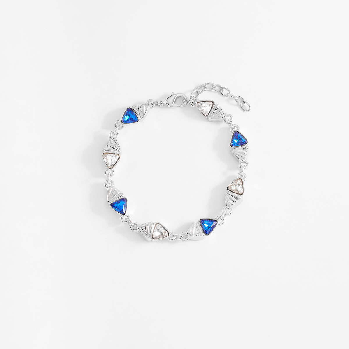 PULSERA EN BAÑO DE PLATINO DE 18 CM + 2 CM DE EXT. CON PIEDRAS COLOR CRISTAL Y AZUL