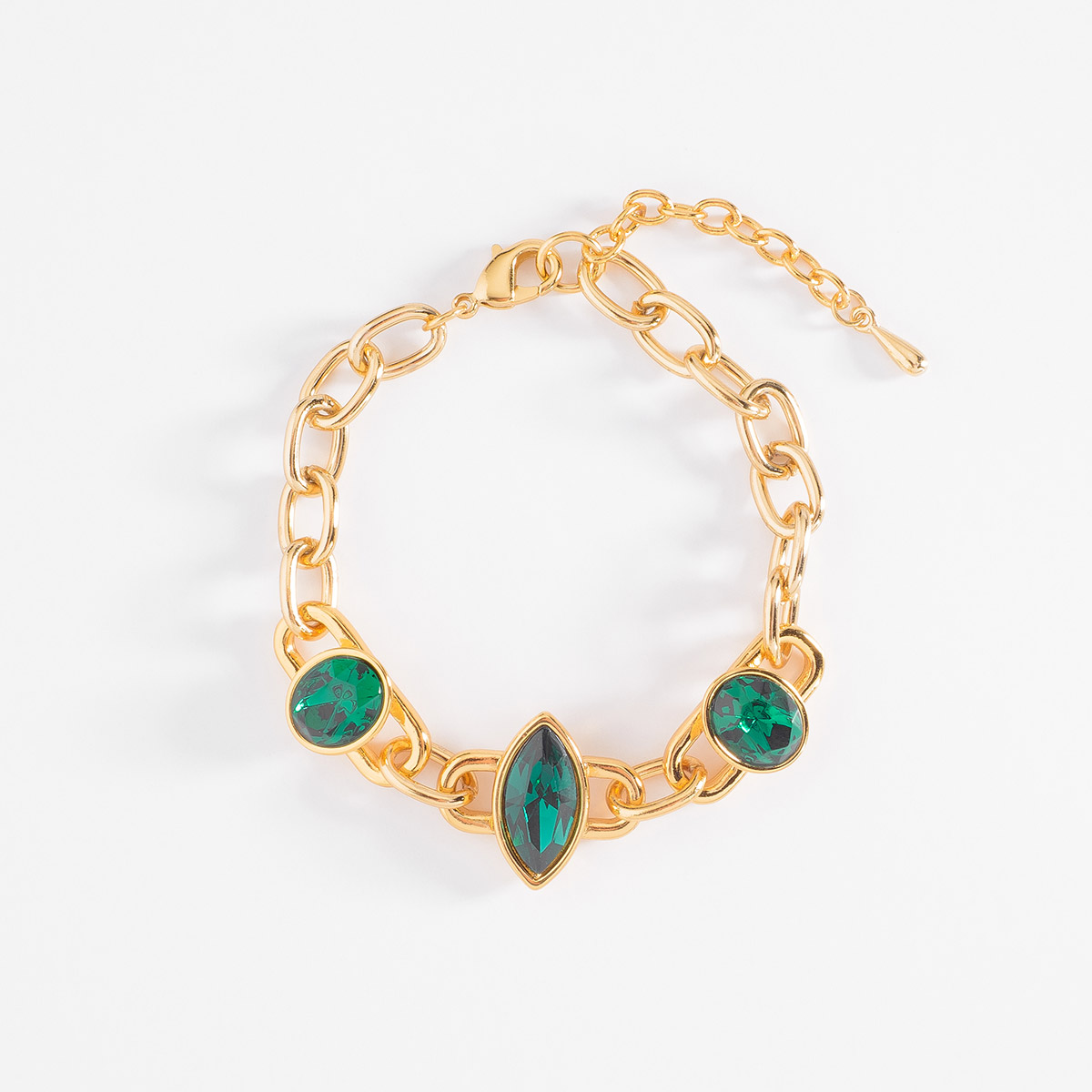 PULSERA EN BAÑO DE ORO DE 17 CM + 3 CM DE EXT. CON PIEDRAS COLOR VERDE