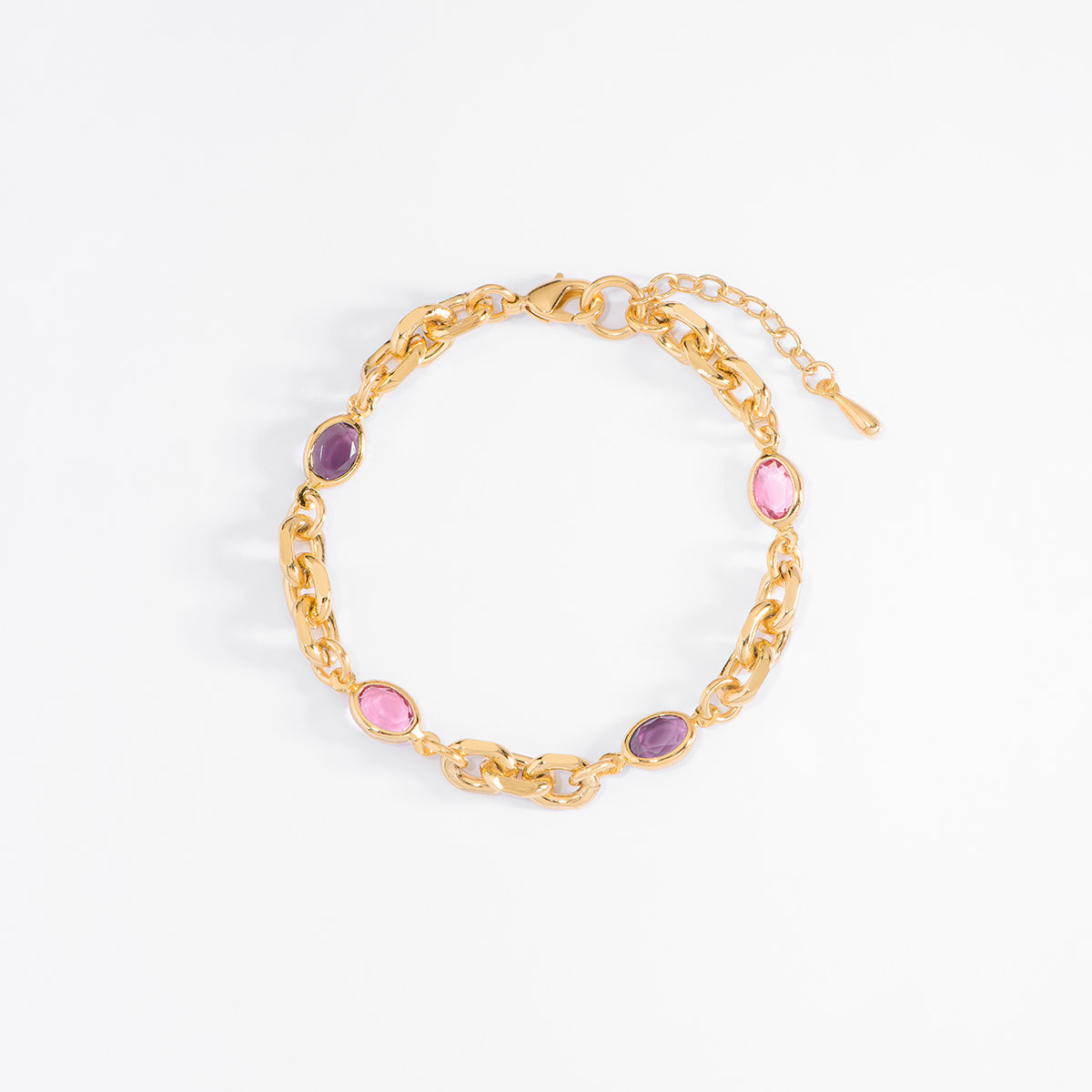 PULSERA EN BAÑO DE ORO DE 18 CM + 2 CM DE EXT. CON PIEDRAS COLOR ROSA Y AMATISTA